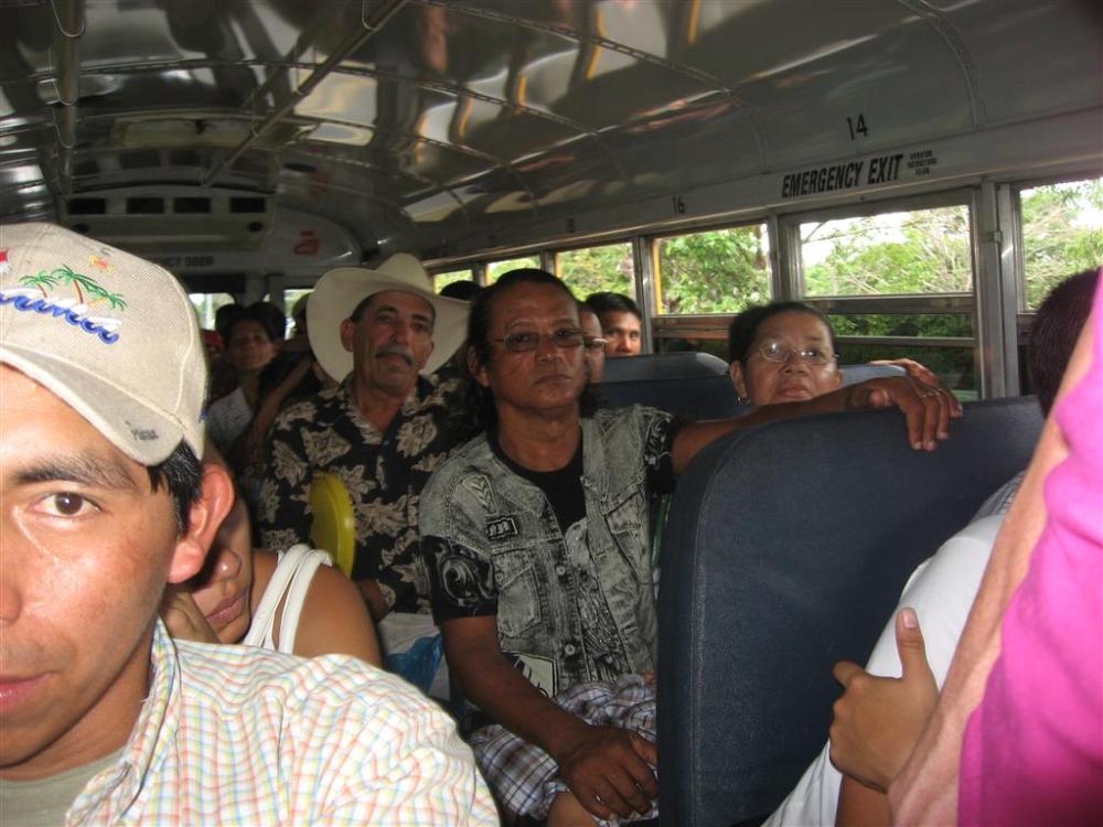 Llegada a David. Capital de la provincia de Chiriquí y segunda ciudad de Panamá con 124.000 habitantes. Es una región peculiar y muy diversa. Tiene bonitas playas y la montaña más alta del país. El sentimiento nacionalista es fuerte y la comunidad indígena Ngöble-Buglé muy numerosa. La estación es un bullir de ir y venir de gentes. Estamos en carnaval, por si no lo sabíais. Estoy más tranquilo ya que desde aquí salen buses a Boquete cada media hora, así que sin prisas me dirijo al lugar del que sale. Nada más llegar una voz me grita si voy a Boquete, le digo que sí y me dirige al bus de los Simpsons. Los americanos trajeron muchos de estos robustos buses amarillos cuando estuvieron a cargo del canal y hoy se utilizan como un medio de transporte más. El problema es que están hechos para niños y no te caben las rodillas en el asiento. Subo al bus y me muero de la risa. Está repleto. Pero repleto repleto. Consigo sentarme al lado de una indígena. Sigue subiendo gente. Incluso se quedan de pie en el pasillo. Y arrancamos. Yo me empiezo a debatir entre sacar una foto del bus o no (podrían molestarse, es de mala educación, igual les sabe mal). Al final pueden más las ganas de enseñaros el bus. Pienso que si me doy la vuelta discretamente, despacito y saco una foto no pasa nada. Un consejo: cuando hagáis algo así, no olvidéis quitar el flash. Os ahorraréis caras como estas