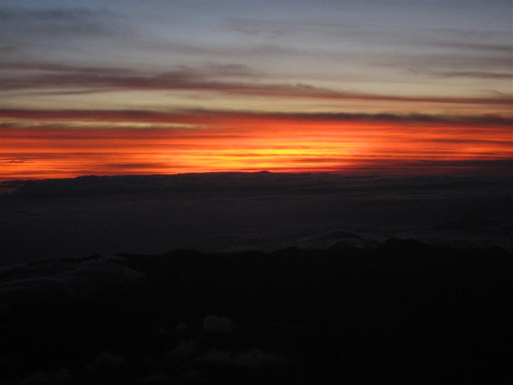Comenzamos la ascensión a las 23:20. Por delante unas seis largas horas de ascensión para salvar los 1.658m de desnivel hasta la cumbre. En la frente una linterna para alumbrar un camino que no presenta ninguna dificultad. Empezamos Malte y Sarah, de Alemania, Julie y Clermont de Francia y un servidor de España. Como buena unión europea, Alemania delante, Francia detrás y yo cerrando el grupo. Al estar el camino tan marcado pudimos permitirnos el lujo de ir cada uno a nuestro paso. Eso hizo que a veces me encontrara sólo en cabeza o muy separado entre ambas potencias. Era una sensación agradable escuchar sólo tu respiración debajo de la pequeña luz. A veces la apagaba y me quedaba solo entre la oscuridad en medio del bosque. Imaginad el cielo sin una nube y a 3.000m de altura: la osa mayor, la menor, Orión, Escorpión… El bosque nos acompañó hasta 100m antes de llegar a la cumbre. Es curioso porque en el Pirineo los pinos empiezan a desaparecer después de los 2.000m. Después de una pequeña trepada que se me hizo un poco desagradable por el cansancio y la oscuridad, pude alcanzar la cima a las 5:33. Francia esperó al amanecer y Alemania decidió que se veía todo igual 50m más abajo. La media hora que quedaba hasta el amanecer se me hizo larga y fría, pero cuando fue llegando la hora se veía esto