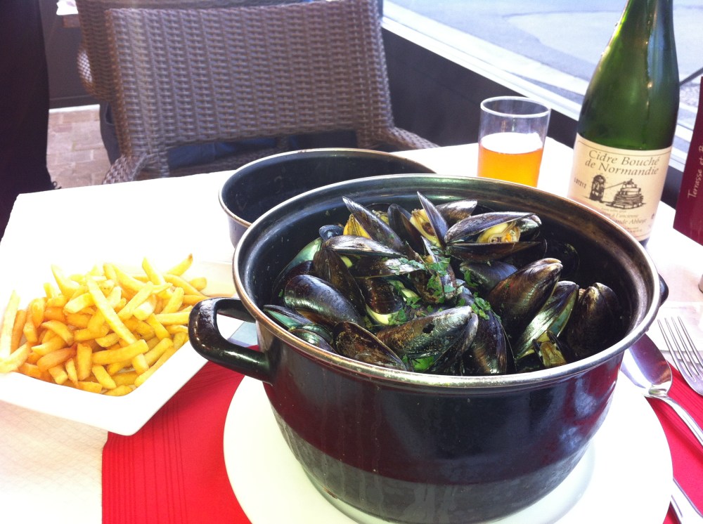 Conseguí tomar el último bus de vuelta a Bayeux y, después de descansar un ratito, me fui a cenar. Una de las especialidades de la zona son los mejillones, deliciosos y proteicos bichitos que me vuelven loco en su humildad y me ponen elementalmente nerudiano. Me pedí una olla de un kilo acompañada de patatas fritas, como manda la tradición. Todo regado con una botella de sidra, también típica. El paisaje era tan bello como el de las playas…