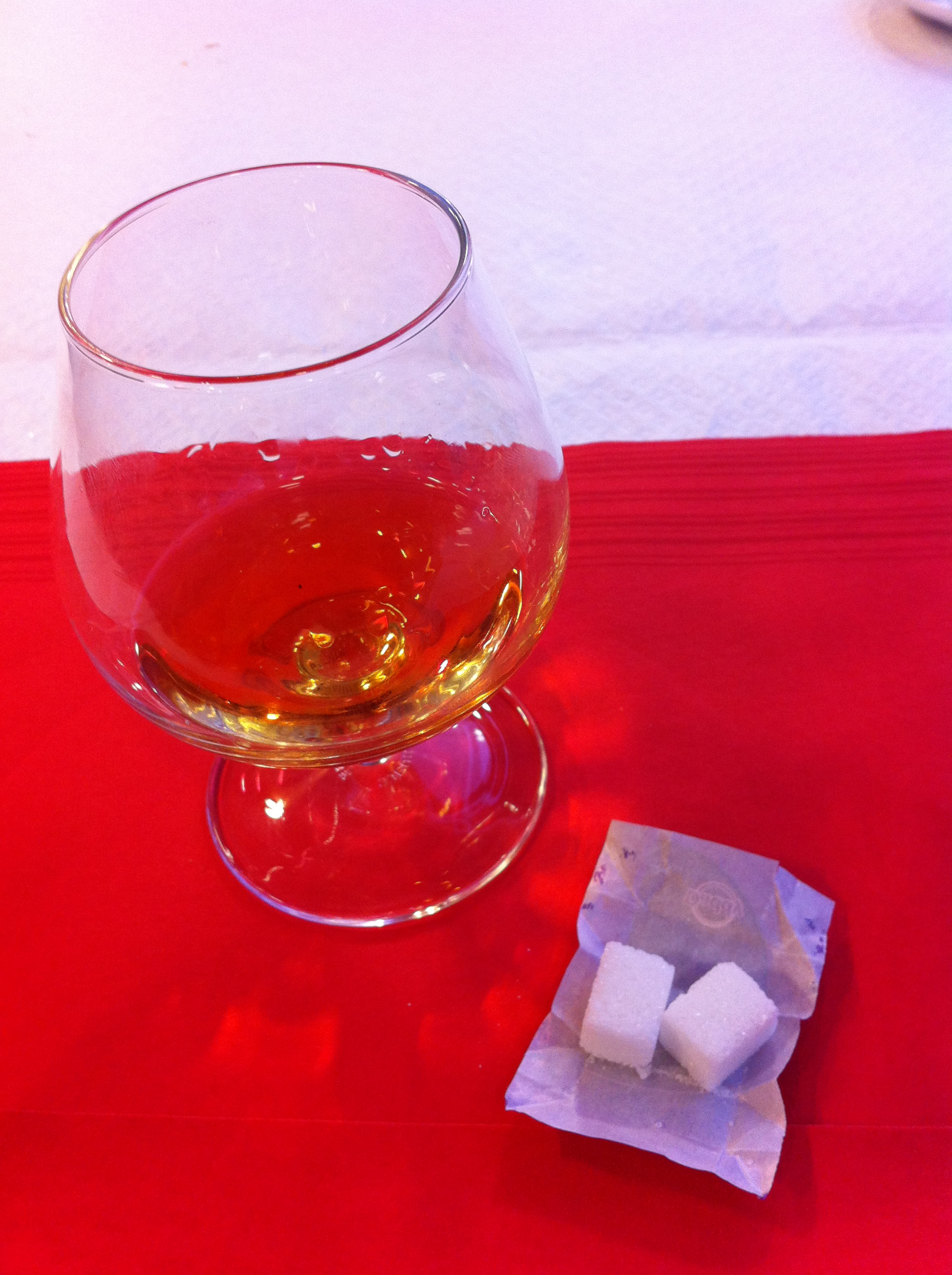 Terminé la cena con un licor típico, el calvados, a base de manzana y de unos 40 grados. Hay quien se lo toma con azúcar, por eso te lo sirven con un terrón delicadamente dividido en dos partes para que tú elijas. Yo sólo la mitad. Muy rico…