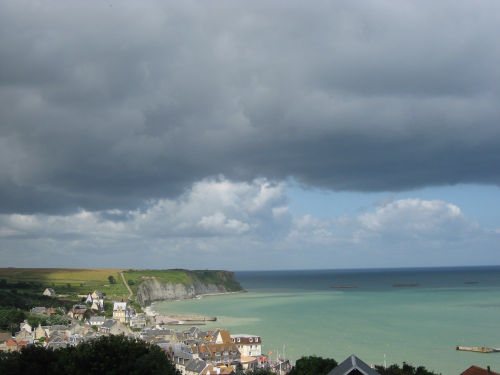 Llegué a Arromanches y me fui directo al museo. Más de lo mismo. Culturalmente fantástico, eso sí. Aquí construyeron los aliados su puerto principal con tamaño de 1000 campos de fútbol y del que todavía se pueden ver restos en la playa. Esto me lo explicó una guía francesa muy simpática en español y, me gustó tanto, que me quedé a escuchar cómo se lo contaba en francés a un grupo de turistas. El museo se ve rápido, así que, después de escuchar a mi guía por tercera vez contando en inglés cómo se fabricaba niebla artificial para proteger el puerto de los bombardeos y de que me obsequiase con una sonrisa de cómo-le-gusta-la-historia-a-este-chico, me marché al último museo que iba a visitar y desde el que se ven estas vistas del pueblo.