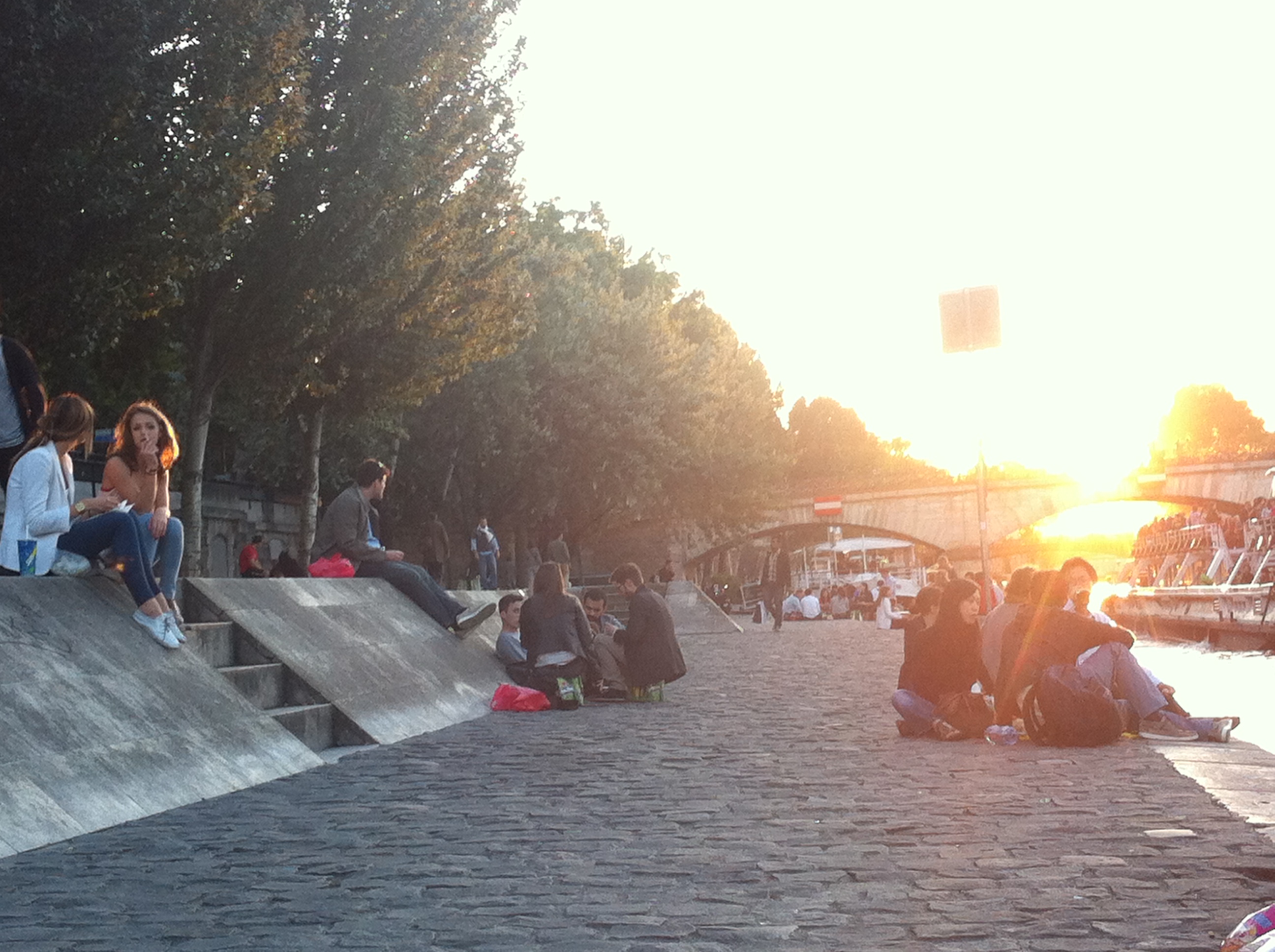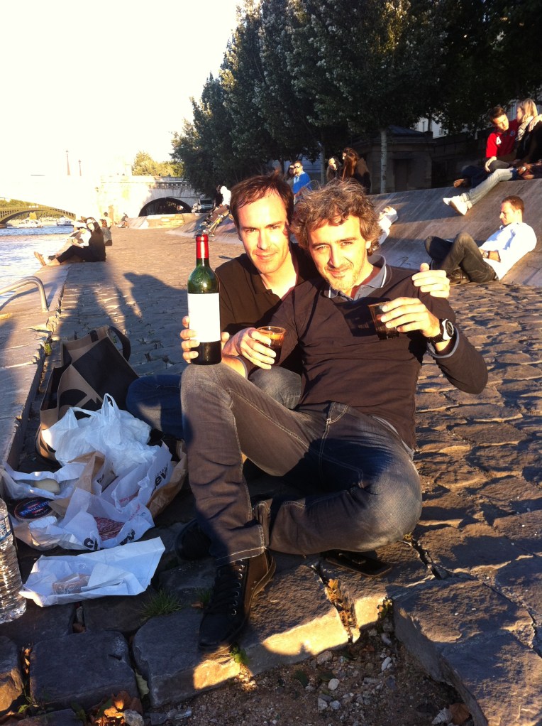 Después de ponernos al día, probar cinco tipos de quesos y bebernos una botella de vino, nos vamos a dar una vuelta por los jardines de Luxemburgo. Reposamos un ratito al sol mientras hacemos planes para la noche. Decidimos irnos a comprar quesos y patés para la cena. Recogemos a su novia y nos vamos a comérnoslo todo a la orilla del Sena. Allí es algo muy habitual. La gente se reúne, unos a cenar con su vinito y sus cosas y otros directamente a hacer botellón. No pasa nada. Nadie grita. La gente conversa y luego no queda ni rastro de botellas ni vasos. Hermosa lección…