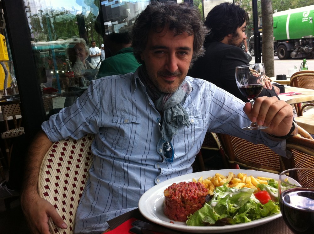 Al día siguiente acompañé a Alban al oculista pese a que él amablemente insistió en que me fuera a dar una vuelta por París. Pero prefiero visitar personas más que ciudades. Después nos fuimos a cumplir con una de mis tradiciones parisinas favoritas. Aquel glorioso 9 de mayo de 1995, víspera del todavía más glorioso gol de Nayim en el Parque de los Príncipes (si algún día tengo un chalet con jardín lo llamaré así) probé por primera vez el Steak Tartare, carnecita cruda aderezada con secretos varios de chef. Me trae muy buenos recuerdos, está riquísimo y va muy bien con el vino. Os dejo esta foto para que comprobéis que la felicidad se contagia. Yo sonrío a Alban y su novia que sonríen al hacerme la foto y la señora del fondo sonríe al ver a mis amigos. Me gusta. Es como un espejo enfrente de otro…