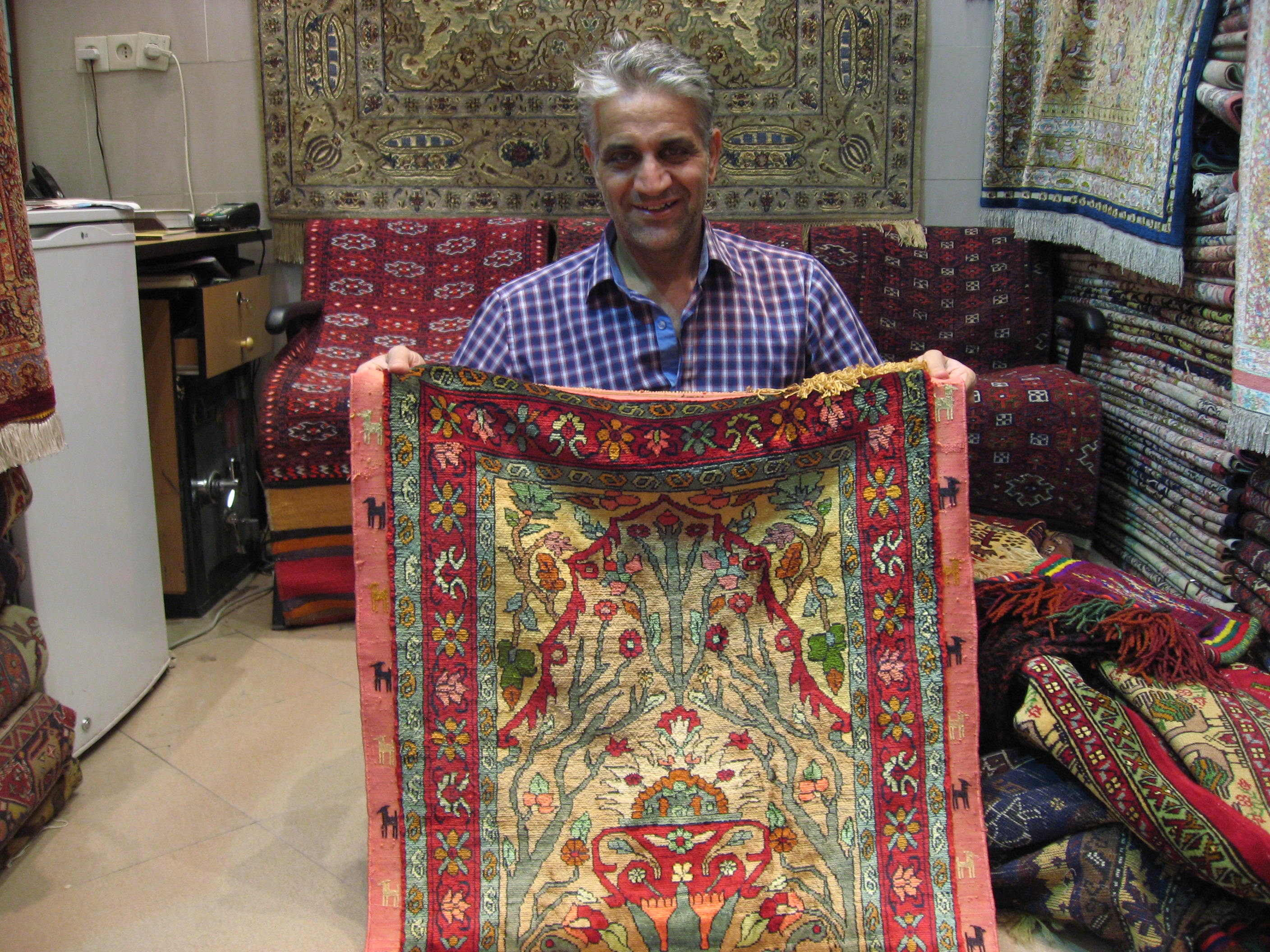 Mi primera parada resultó fallida, son los últimos días de Noruz y todo está cerrado. El Noruz es el fin de año iraní. Comienza el 21 de marzo y dura dos semanas. Las familias se reúnen alrededor de la radio que, a modo de nuestras campanadas, comunica exactamente el momento en el que el sol cambia de hemisferio dando lugar a la primavera. En ese momento todos se felicitan y los niños reciben sus regalos. El país se paraliza y resulta difícil viajar, por eso yo retrasé mi llegada unos diez días. El hecho es que el bazaar estaba cerrado y me marché enseguida. Eso sí, me dejé secuestrar por un vendedor de alfombras que al grito de “Italia, Italia, tapeto, tapeto” (¿por qué me confundirán siempre con un italiano?) me llevó a su tienda y me estuvo enseñando estas maravillas. Me las hubiera llevado todas pero no son baratas. Las pequeñas tamaño bandeja, alrededor de 250€, y la que sostiene el señor Toranj unos 800€. Eso sí, son hechas a mano en seda y no te cansas nunca de acariciarlas. Si alguien está interesado me lo decís.