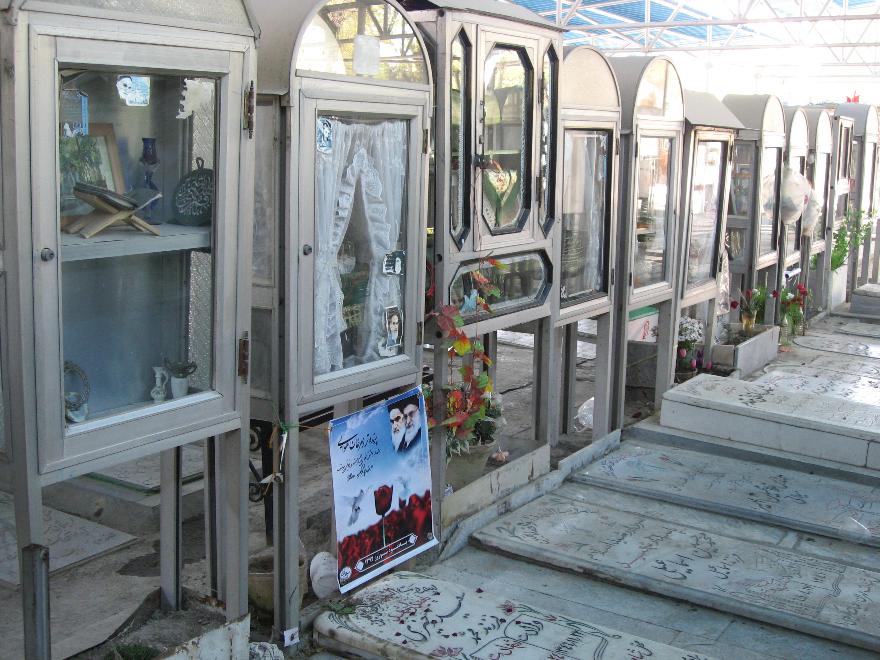 Las cosas cambiaron en el durísimo memorial a los mártires de la guerra con Iraq. Fotos muy duras de las víctimas, haciendo comparativas de imágenes en vida del difunto con las de su cuerpo destrozado en la batalla o imágenes de sus familiares durante el entierro. No he visto en mi vida nada parecido. Había leído algo de la relación de los chiíes con el martirio y la muerte, pero me quedé patidifuso. Esta zona del cementerio está llena de urnas de cristal con imágenes y objetos personales de las víctimas y a cubierto. Algo así…