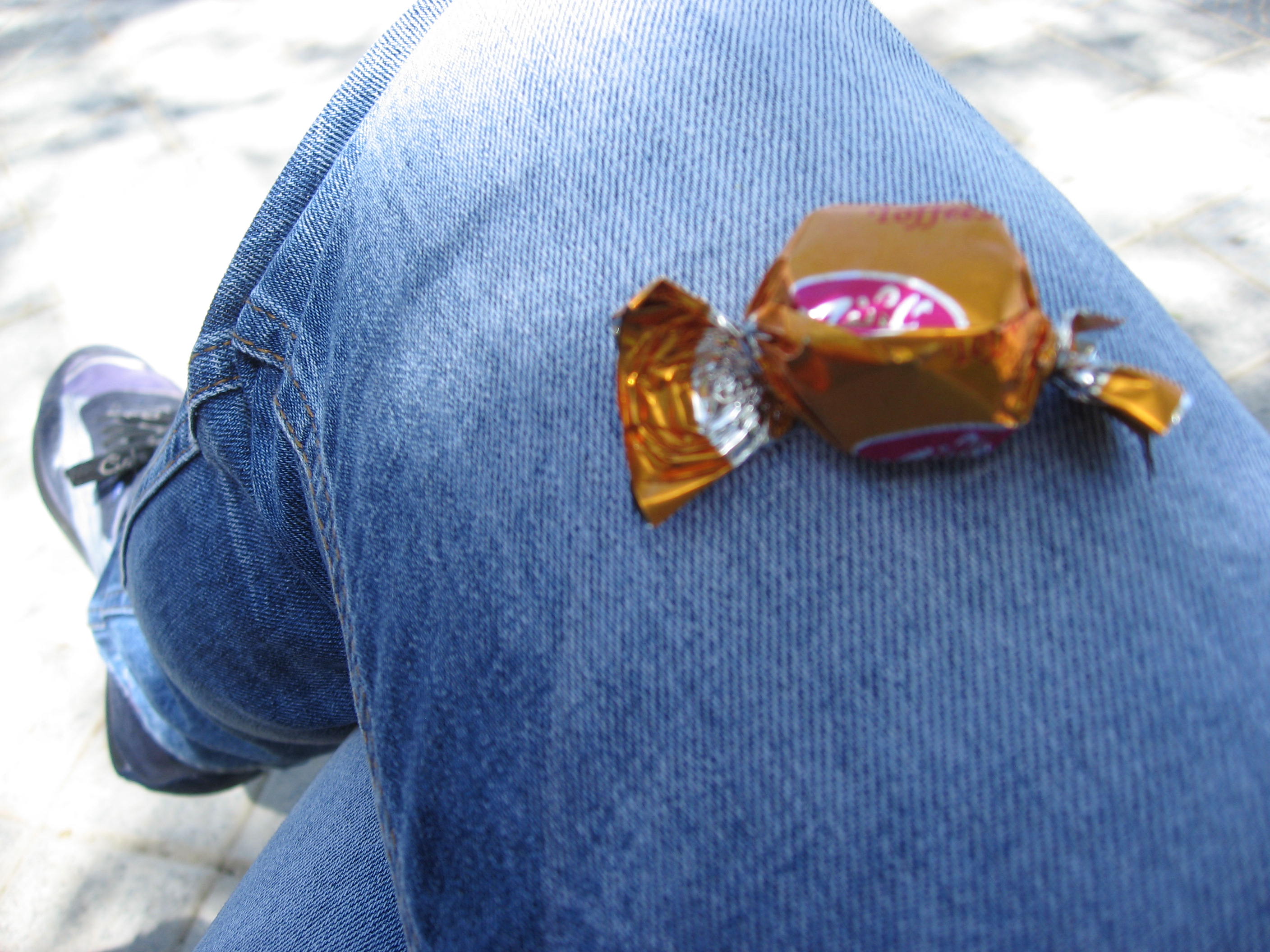Que foto mas bella,un bombón sobre una rodilla.( x el comentario que hiciste referente a los presentes culinarios del difunto) y un bombón en un cementerio dice tanto!