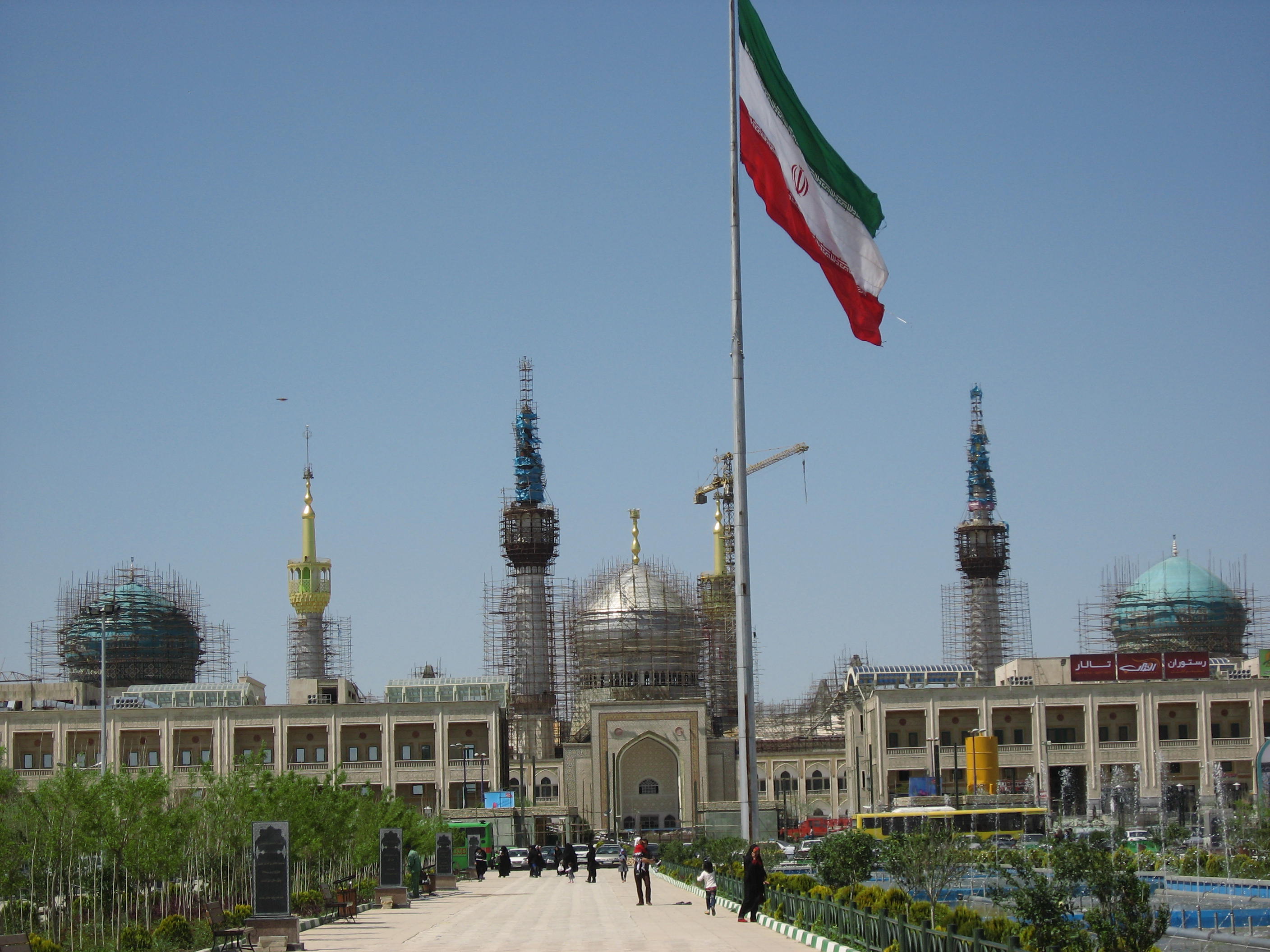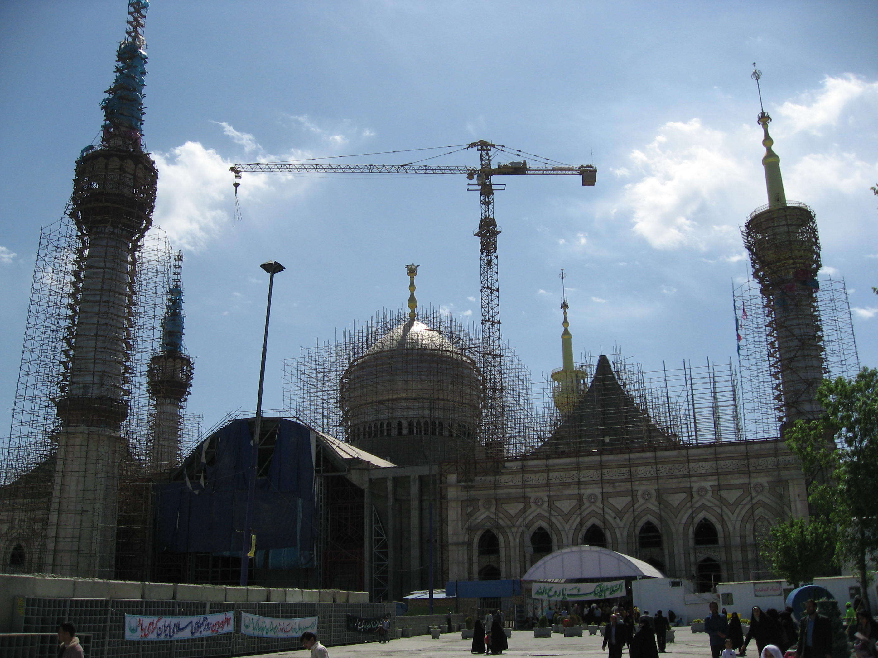 Muy cerca está el lugar donde está enterrado Jomeini, el líder de la revolución. Allí me dirigí. No había ni rastro de extranjeros (la verdad es que fuera del hotel sólo he visto a tres) y me pregunté si haría bien entrando a un lugar tan especial para estas personas. Me lavé las manos y antebrazos al rito musulmán. Unos niños me miraban y se reían. Dejé mi bolsa y mis zapatos a la entrada y traté de mimetizarme. La tumba está en una especie de cuadrado rodeado de unos muros verdosos y transparentes con unas rejillas a través de las cuales los fieles introducen miles de billetes. Me llamó muchísimo la atención ver la tumba de un personaje histórico rodeado de tanto dinero. Después me senté a ver cómo la gente rezaba y los niños se revolcaban jugando sobre las alfombras. También me llamó mucho la atención esa mezcla de infancia y solemnidad. Recogí mis cosas y me marché. Vista atrás del mausoleo en construcción…