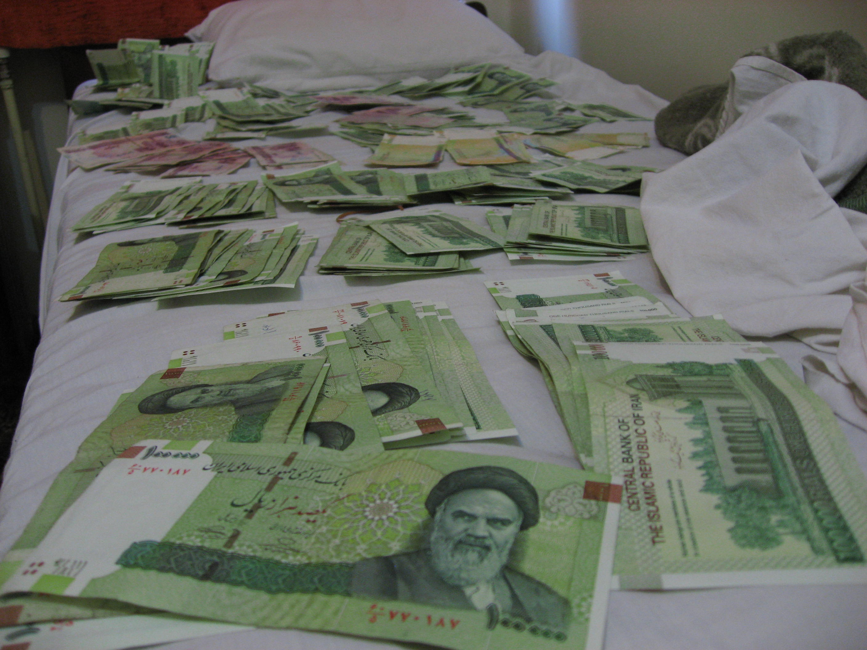 Y como todo absolutamente está cerrado en Noruz, no pude hacer nada más. Por suerte encontré una única casa de cambio de moneda abierta y pude cambiar 500€ a 43.500 riales por euro, lo que da un total de 21.750.000 riales. ¡Millonario!. Me sentía mitad Tío Gilito, mitad Joe Dalton. Así que, como las personas necesitamos cada día, además de nuestras raciones de agua, calorías y horas de sueño, también nuestra ración de risa, me fui rápidamente al hotel, los extendí todos encima de la cama, y me puse a jugar un rato y a tirarlos al aire mientras daba vítores a la inflación. Un hombre es lo que queda de un niño…;)