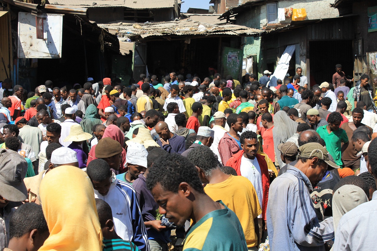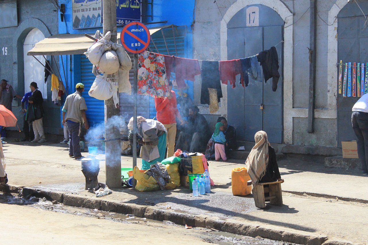 …gente, gente, gente…gente mercado chat etiopia…y mendigos, muchos mendigos. Me llamó la atención que se reúnen como en gremios. Los ciegos, los inválidos, los locos… Sí, hay ciegos, por supuesto sin gafas, que caminan con palos de madera por la calle. Otros fuman sentados mientras se envuelven en sus harapos para que no se les escape el humo mientras farfullan desde el interior. Y luego están los jovencitos que te piden por pedir y que te agarran de los brazos. Tuve que ponerme un tanto agresivo y pegar un par de empujones cuando tres chicos de unos 14 años se pusieron especialmente pesados. Luego me di cuenta de que eran casi de mi altura y que sus músculos serían la envidia de Cristiano Ronaldo y pensé que quizá no fue tan buena idea, pero dio resultado y me dejaron en paz…