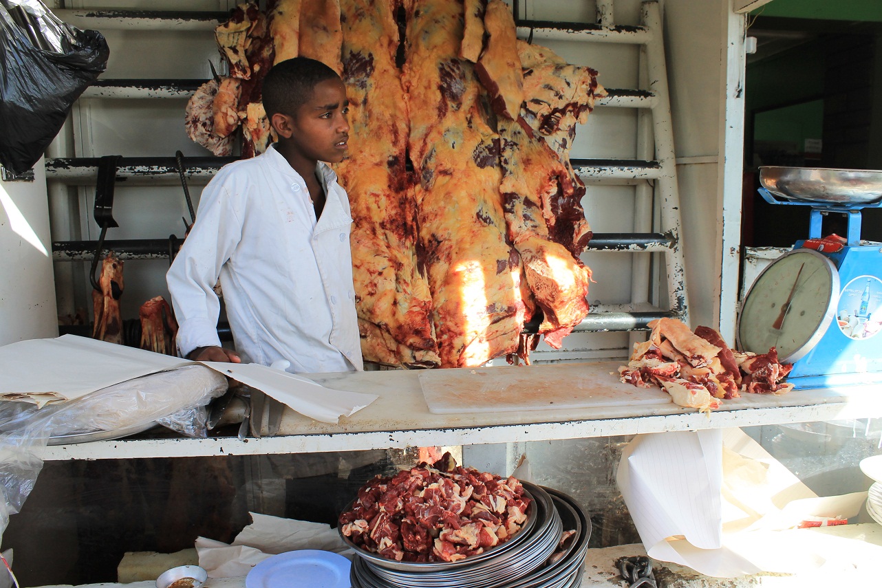 Gracias a mis nuevos amigos pude probar una cosa que me despertaba mucha curiosidad. Los etíopes cultivan una planta llamada “khat”, que se pronuncia “chat”. Parece ser que tiene propiedades alucinógenas o relajantes y es bastante adictivo. Se reúnen en pequeños antros que, con un poco de imaginación, te recuerdan a los fumaderos de opio del sudéste asiático y, como pacíficas cabras, van a arrancando hojas una a una y se las comen. Algunos arrancan muchas más y el bolo que se les forma al masticar les asemeja más a vacas de mirada pacíficamente perdida que a cabras. El gobierno quiere prohibirlos, pero de momento ahí siguen. Como es aconsejable comer algo para que no se te suba mucho, primero nos fuimos a un lugar especializado en carnes. Gracias a mi juramento egipcio, no me intimidaron un ápice las condiciones de conservación de la materia prima…carniceria etiopia
