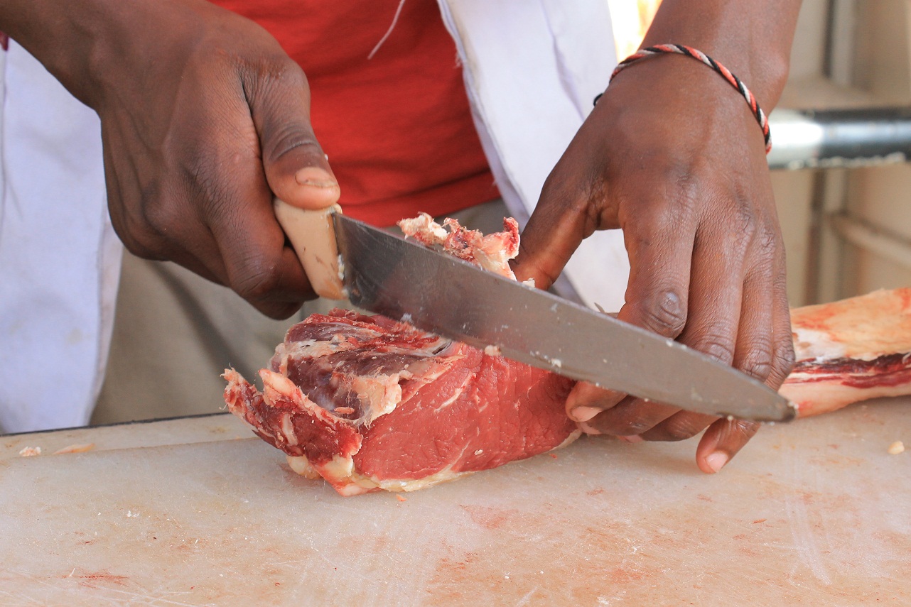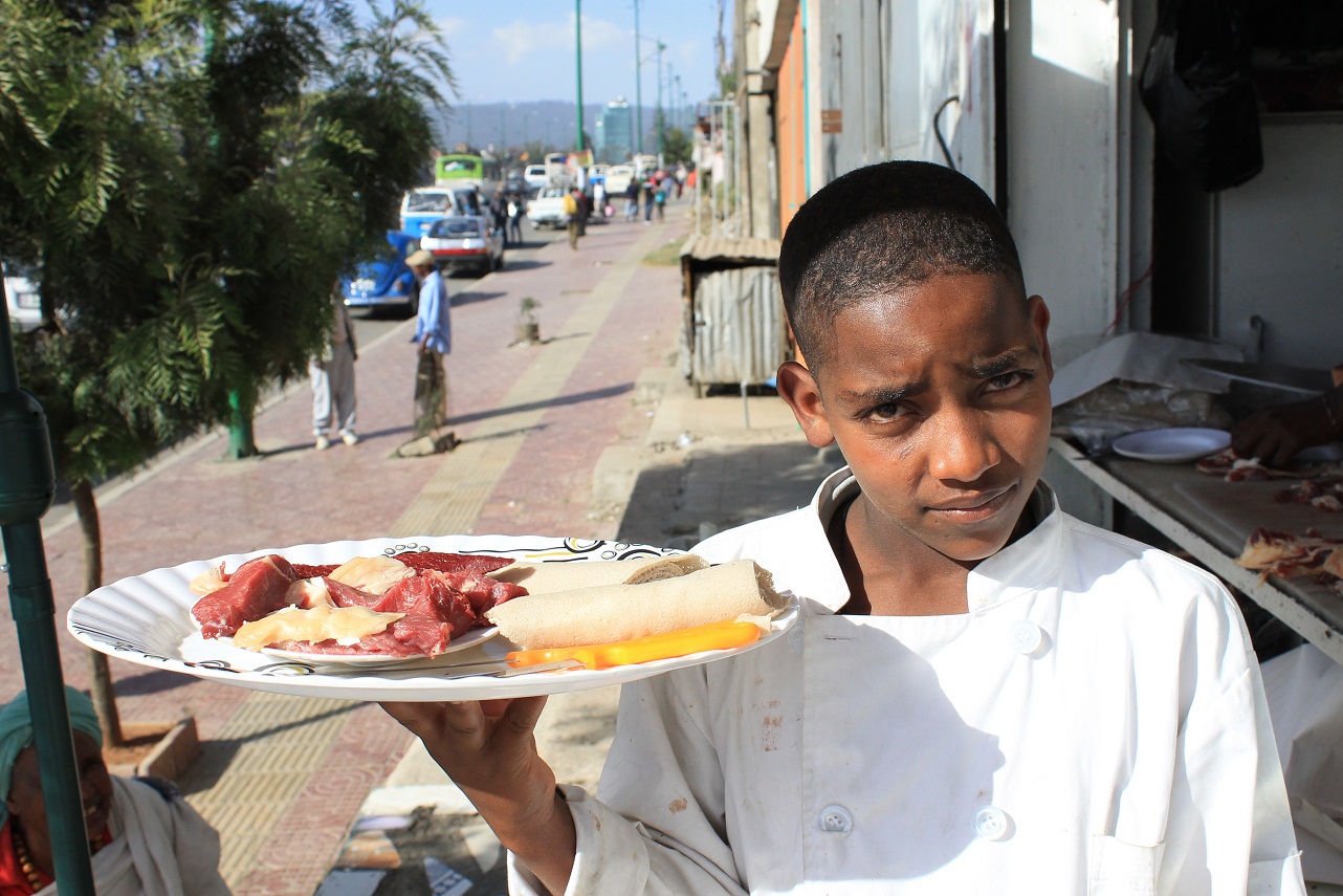 manos carnicero etiope 2El resultado me fascinó pese a la cara de hastío de nuestro joven camarero, que no carnicero. Nos sirvieron el manjar junto a unos poderosos picantes de los que, naturalmente, di buena cuenta. La carne te la comes cruda. La coges con una mano y con la otra en el aire la cortas con esos cuchillos. No estaba especialmente tierna pero los picantes te alborotaban el espíritu y las papilas y comí bastante. El picante verde-mostaza era especialmente bueno…niño etiope camarero carne