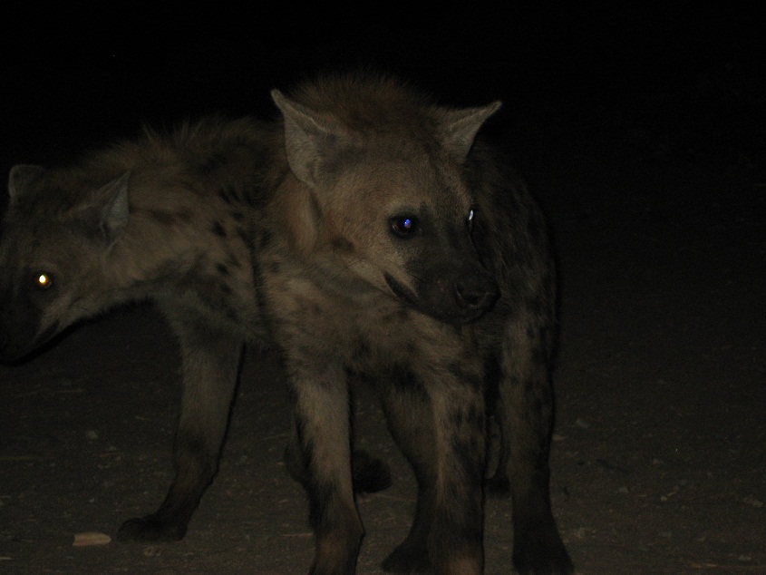 Nada más llegar, una pareja polaco-ucraniana y yo contratamos los servicios de un guía que, a eso de las siete de la tarde cuando ya era noche cerrada, nos llevó a verlas. Siento cierta simpatía hacia esos animales que caen mal a los seres humanos. Ratas, buitres, hienas… son bichos estéticamente incomprendidos que también tienen su corazoncito (los buitres, por ejemplo, permanecen fieles a su pajarraca durante toda la vida y cuidan juntos de los pollos que les salen de los huevos). Así que allí estaba yo, delante de los faros de varios coches y motocicletas viendo acercarse tímidamente al temido segundo depredador africano. Sus mandíbulas están preparadas para triturar los huesos de la carroña que comen y, mientras un Rottweiller muerde con 25 kg de fuerza por centímetro cuadrado, la hiena lo hace con 78, y eso que sólo pesa unos 60. Animalico… Pensaba que me iban a inspirar un poco de repelús pero reconozco que me sorprendieron gratamente. Mirad qué caritas…