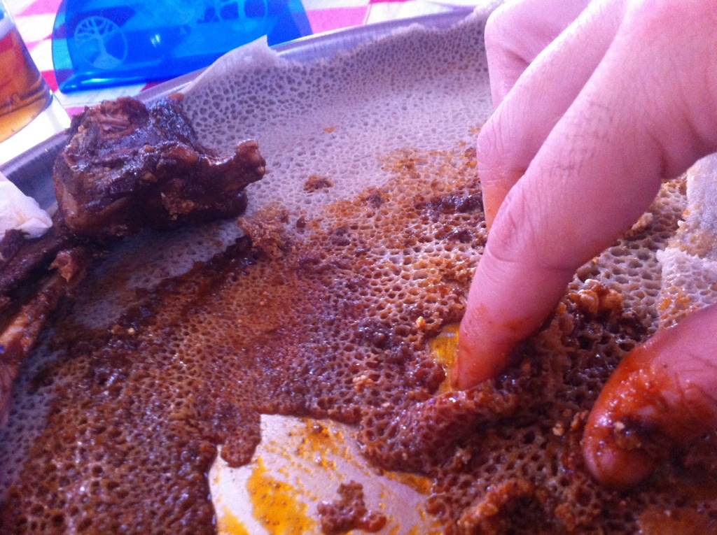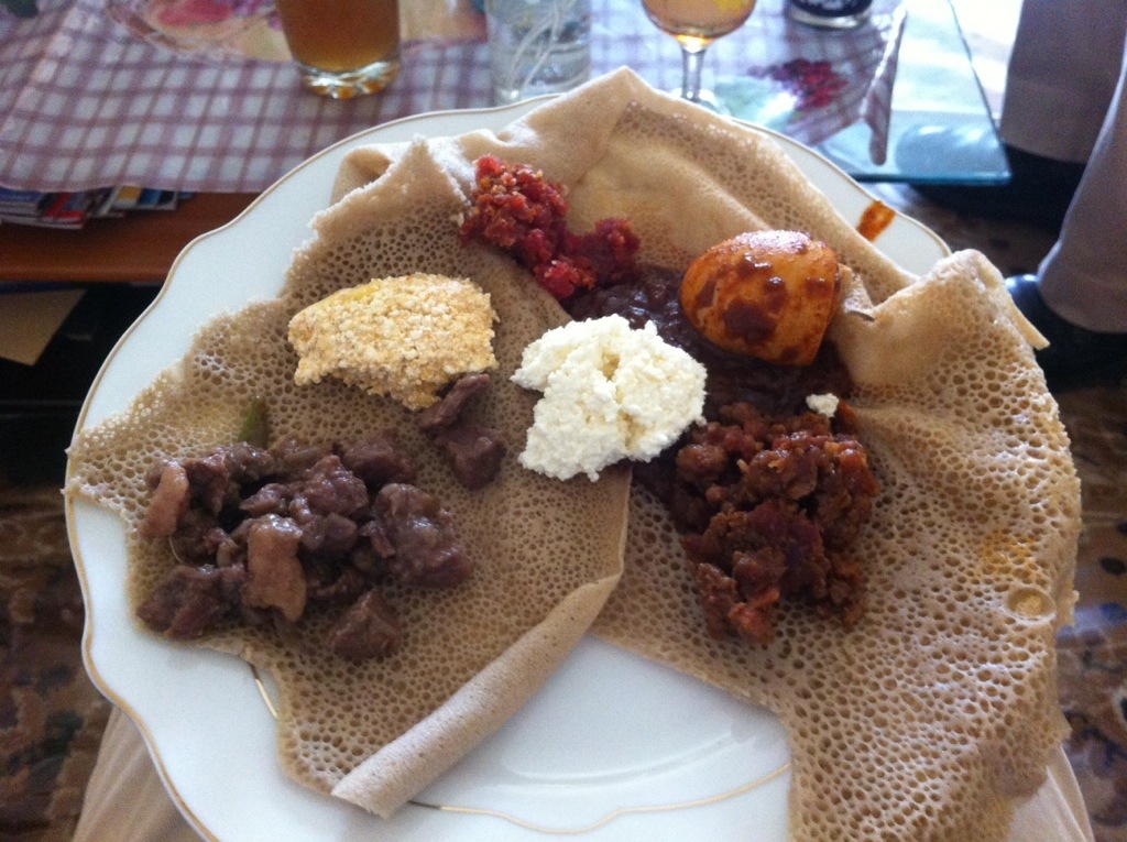 Más Doro Wat con su huevo incluído, quesos, carnes en salsa y carnes crudas. Y la sábana apulmonada que sirve de base es la inyera. Se cortan trocitos pequeños de ésta y se cogen los alimentos, pero como no es impermeable acabas poniéndote perdido. Este soy yo otro día en un restaurante…