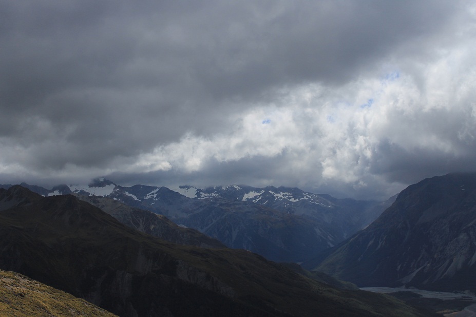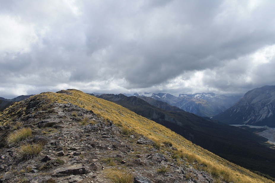 En la isla sur hay un tren que une las ciudades de Christchurch y Greymouth que atraviesa los Alpes del Sur y dicen que es de los más bonitos que existen.  Como la carretera sigue prácticamente la línea férrea decidí seguir esa ruta y acampar justo en el medio de la misma. La noche fue más cálida de lo previsto aunque muy lluviosa, y me desperté con ganas de empezar a andar. Primeras fotos de mis cimas…