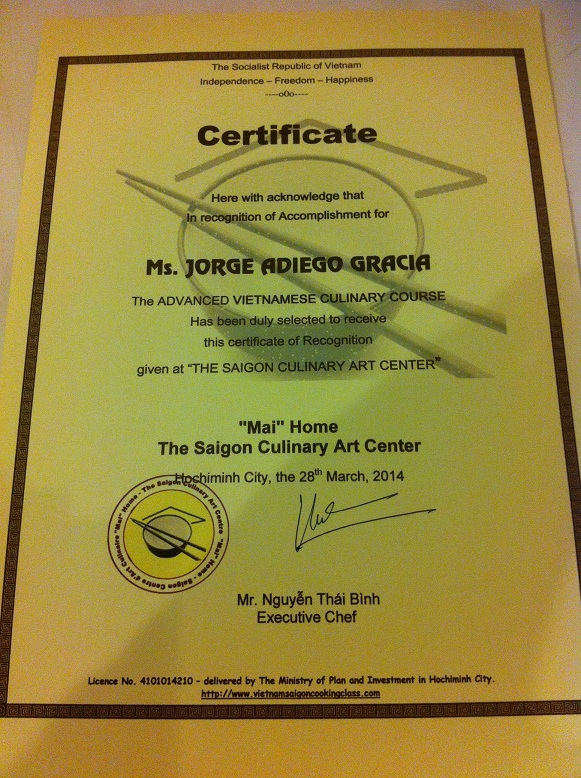 La República Socialista de Vietnam me daba el aprobado. Foto de mi título oficial con el chef. Mis sudores son mezcla de calor, gorro y examen…