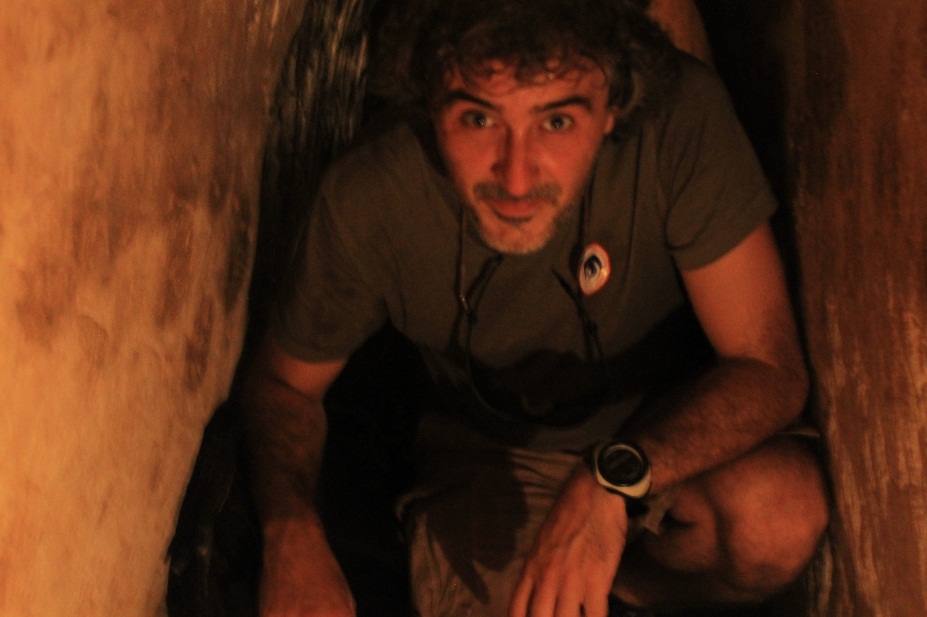 Pero la guinda de la visita estaba todavía esperándome. Al final te ofrecen la posibilidad de atravesar 20 metros de túnel subterráneo que los pequeños vietnamitas utilizaban para desplazarse y atacar sin ser descubiertos. El sitio no tiene más de metro y veinte de alto y es bastante húmedo y caluroso, pero pensé que por 20 metros tampoco me iba a morir. Me sorprendió que mucha gente se negaba a entrar. Pronto me iba a dar cuenta del porqué. Yo entré el penúltimo con un único compañero detrás de mí. Y en cuclillas claro. Mis rodillas empezaron pronto a sufrir. Me pareció un lugar tan monstruoso que pensé en vosotros y en cómo transmitirlo, así que saqué la cámara como pude. Al seguir avanzando no vi a nadie y pensé “jo, cómo corre la gente, qué ganas de salir, normal…” así que aceleré el cuclilleo. Yo no veía a nadie y sólo oía voces laterales provenientes de algo que parecían ser túneles de ventilación. Me empecé a agobiar. Los veinte metros se me estaban haciendo eternos. El dolor de rodillas me hizo cambiar de postura y empecé a gatear mientras empujaba la mochila delante de mí. Penumbra, humedad, cansancio, sudor… Después de mil años, y nunca mejor dicho, vi la luz al final del túnel. Aliviado trepé hacia la vida y esperé a mi compañero. Ambos nos dimos un sudoroso abrazo en medio de la selva. Unos sesenta metros atrás vimos al resto del grupo. Lo que parecían túneles de ventilación eran salidas. Al sacar la cámara no vi que la gente salió por la primera de ellas, así que, junto a mi último y desdichado compañero, nos habíamos comido 80 metros de túnel hasta llegar a la salida final. Feliz cumpleaños Jorgico…