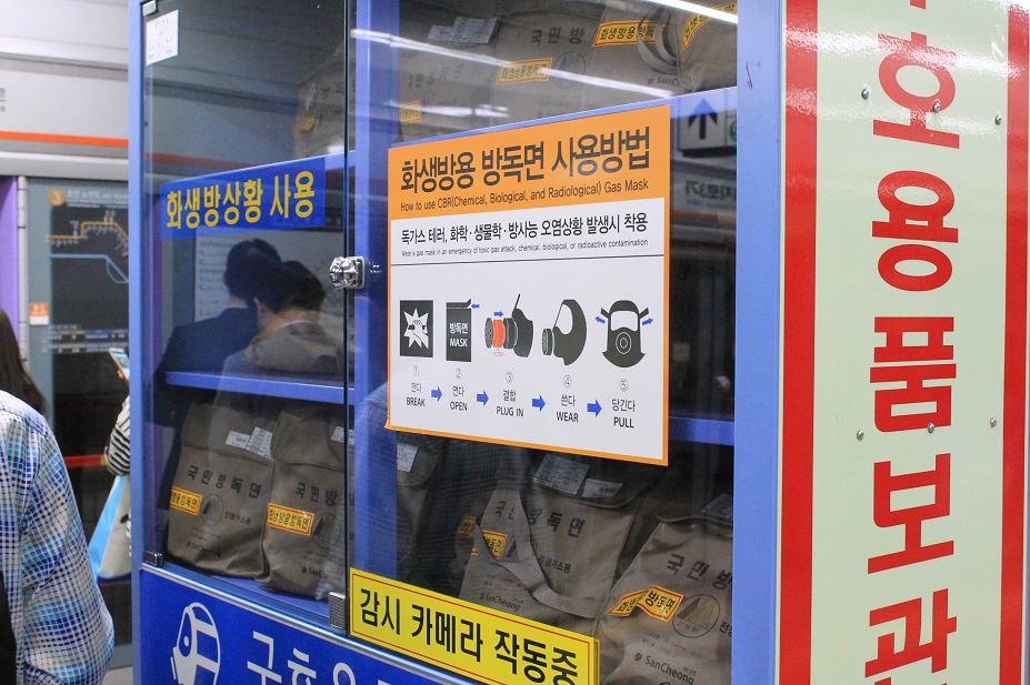 El segundo motivo es el miedo a posibles ataques (¿de los hermanastros del norte?), así que es frecuente ver en todas las estaciones armarios que guardan cámaras anti gas como estas…