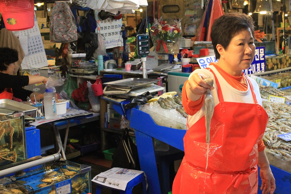 …visitas a mercados de peces, con señoras que alardean de su género, y señoras que se desplazan sobre el mismo como arañas en su tela.