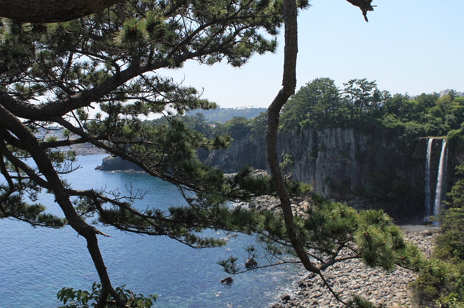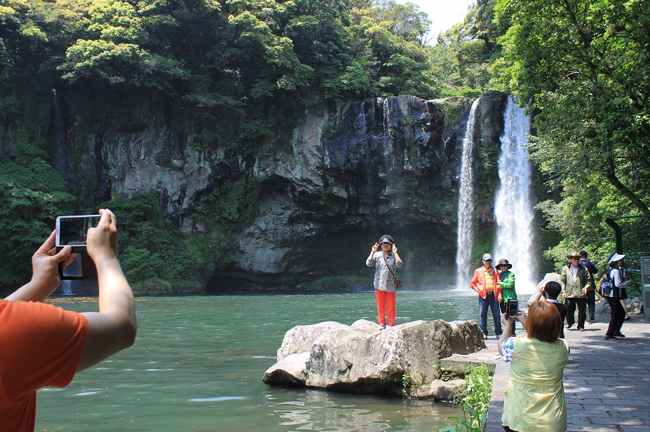 Quise tomar el ferry a Jeju, pero los 43€ y las 12 horas de viaje sucumbieron a los 24€ y 45 minutos de vuelo. La capital se llama Jeju-si, pero ya había decidido que Jeju no y tomé un bus a la ciudad de Seowipo, en la otra punta de la isla, que es una base mejor para hacer excursiones. Lamentablemente decidí cambiar los grandes ascensos por paseos de agüelo y visitar dos cascadas muy populares entre los visitantes. Me pasé un buen rato observando a la gente feliz haciéndose las mismas fotos y reflexionando sobre la entrañable vanidad del ser humano…