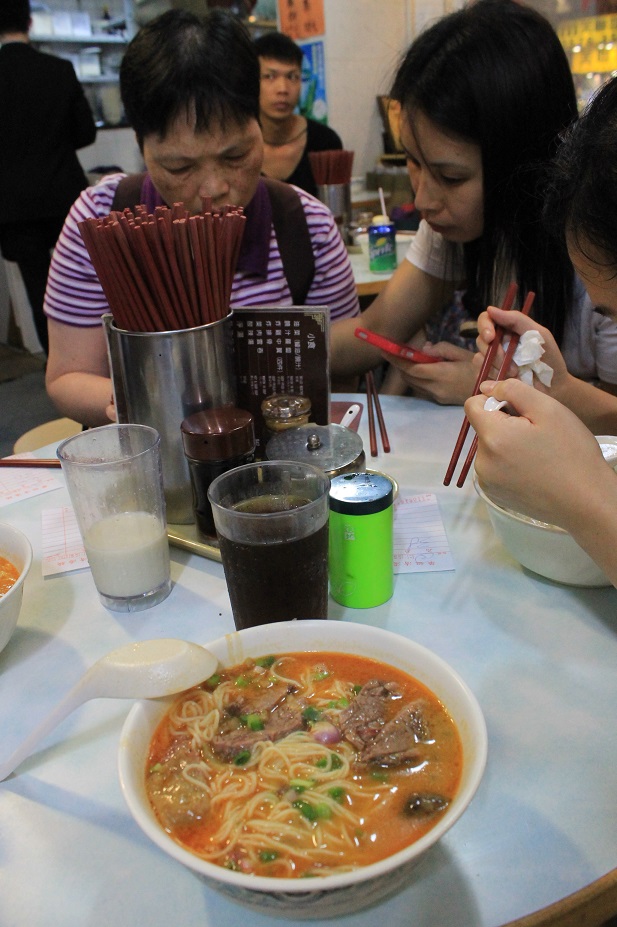 Sigamos con mi enamoramiento. La comida. No sé si influyó que venía de donde venía, pero la comida es fabulosa. Y, milagro, baratísima. La gastronomía cantonesa es famosa en el mundo entero. Si a eso le añades que una ciudad como esta tiene restaurantes de todo tipo, elegir un lugar donde almorzar o cenar se convierte siempre en una dura elección. Este es uno de mis platos favoritos: fideos en sopa picante de cacahuete con trozos de una ternera que, seguro seguro, había tenido una vida plena y feliz. Mientras se deshacía en mi boca creí que me sonreía desde el cielo de las vacas…