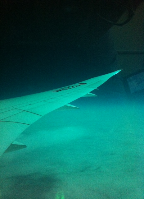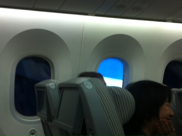 El vuelo transcurrió sin incidentes, pero me veo obligado a hablaros un poquito de la maravillosa aeronave que me trajo de vuelta a “casa”. El Boeing 787 Dreamliner no me defraudó en absoluto. Fino, es un avión fino y elegante. La fibra de carbono con la que está construido lo hace más ligero y permite hacerle grandes ventanillas que en vez de cerrarse se tintan. Y las alas del mío eran ligeras como las de una garza nipona…