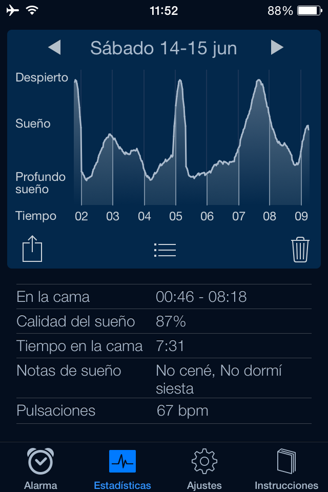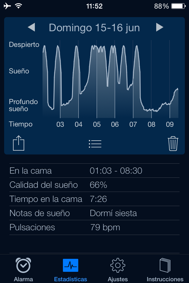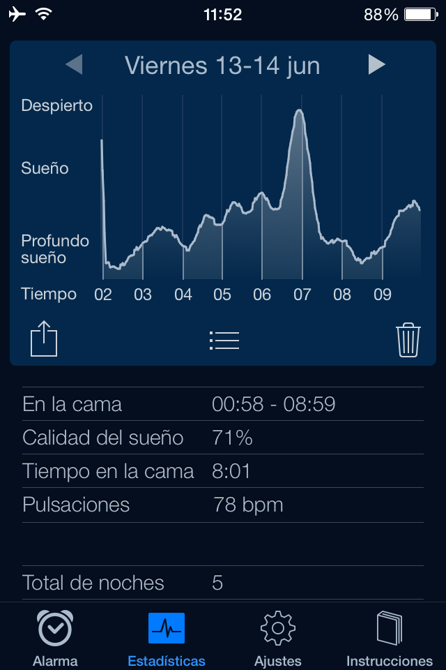 Como podéis comprobar, me quedé dormido al instante a eso de las dos de la mañana, para ir poco a poco saliendo de un sueño profundo hasta despertarme a eso de las siete, leer vuestros mensajitos en el móvil, y volverme a quedar profundamente dormido hasta casi las diez. Dos ejemplos más para finalizar, uno con dos despertares en mitad de la noche a eso de las 5 y 7:30…