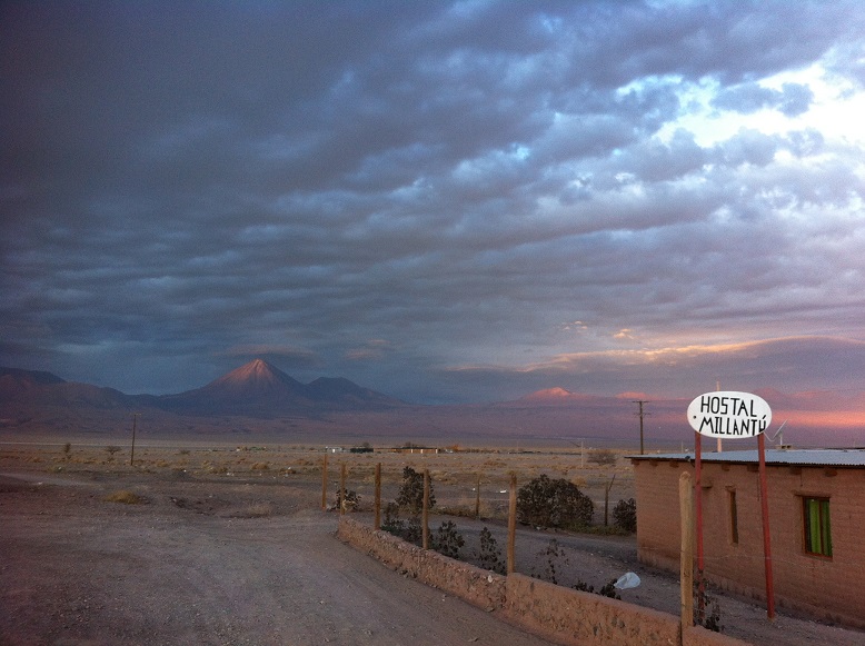 atacama desertEsa nubecita marrón que se ve en el horizonte es la arena que el temporal levanta y que se te clava como alfileres al pasear. Y sin duda lo mejor fue el atardecer…
