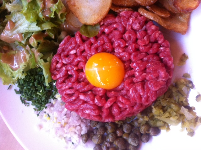 El vuelo de São Paulo a París con Royal Air Maroc no tuvo mayor historia que las grandes turbulencias a la llegada. Alegría y alivio al poner pie en tierra a las 16:05 y pensar que ya no tenía que tomar más aviones. La alegría se esfumó al comprobar que mi equipaje no había llegado conmigo. Al reclamar la pérdida me dijeron que volviera a las 23:00 y que había un 90% de posibilidades de que allí estuviera. Al día siguiente salía hacia los Pirineos en tren, así que temblaba ante la posibilidad de no poder contar con mis botas y toda la ropa de montaña. Pasé esas horas un tanto preocupado, menos mal que en el mismo aeropuerto estaba Alban para hacérmelas más llevaderas. Ya os presenté a mi amigo en aquel viaje a Normandía pero lo voy a volver a hacer. Se ha convertido en una tradición que Alban me reciba en su casa con una variedad de quesos, embutidos, vinos y licores que es imposible dejar de probar. Y cuando acabamos con ellos, seguimos con la siguiente tradición, que es irnos a tomar un steak tartare… Os re-presento a mi amigo. La cara que está a su lado es la que se le queda a uno después de 12 horas de vuelo, tres de escala, un equipaje perdido, cuatro variedades de queso, una de embutido, más de media barra de pan (ay, cómo lo echaba de menos) y, de verdad que no exagero, siete variedades de vinos y licores…