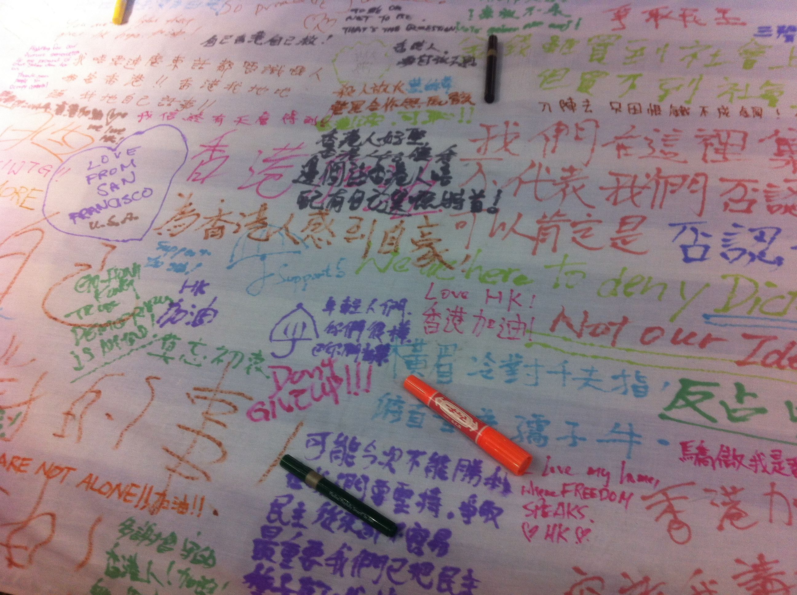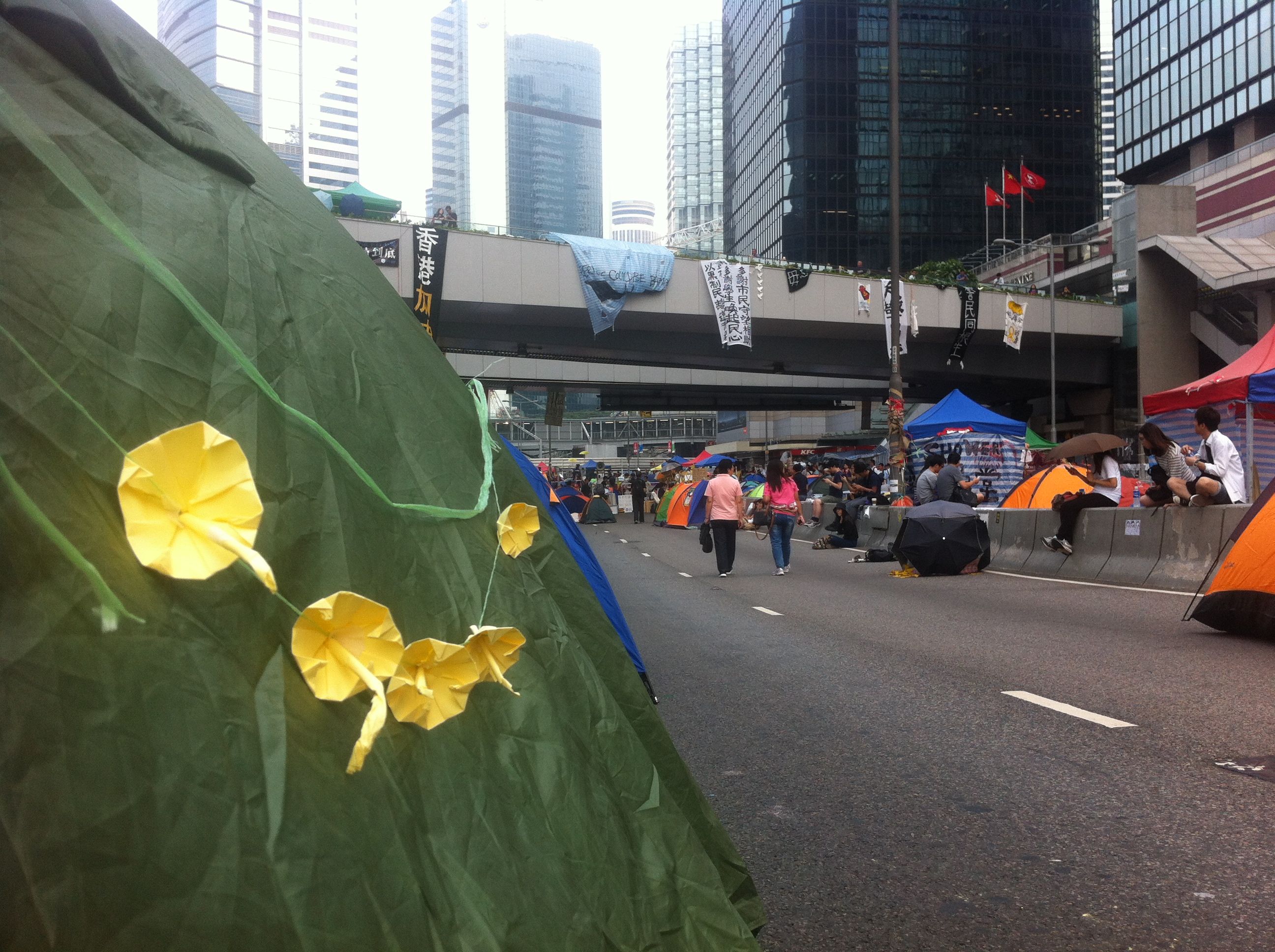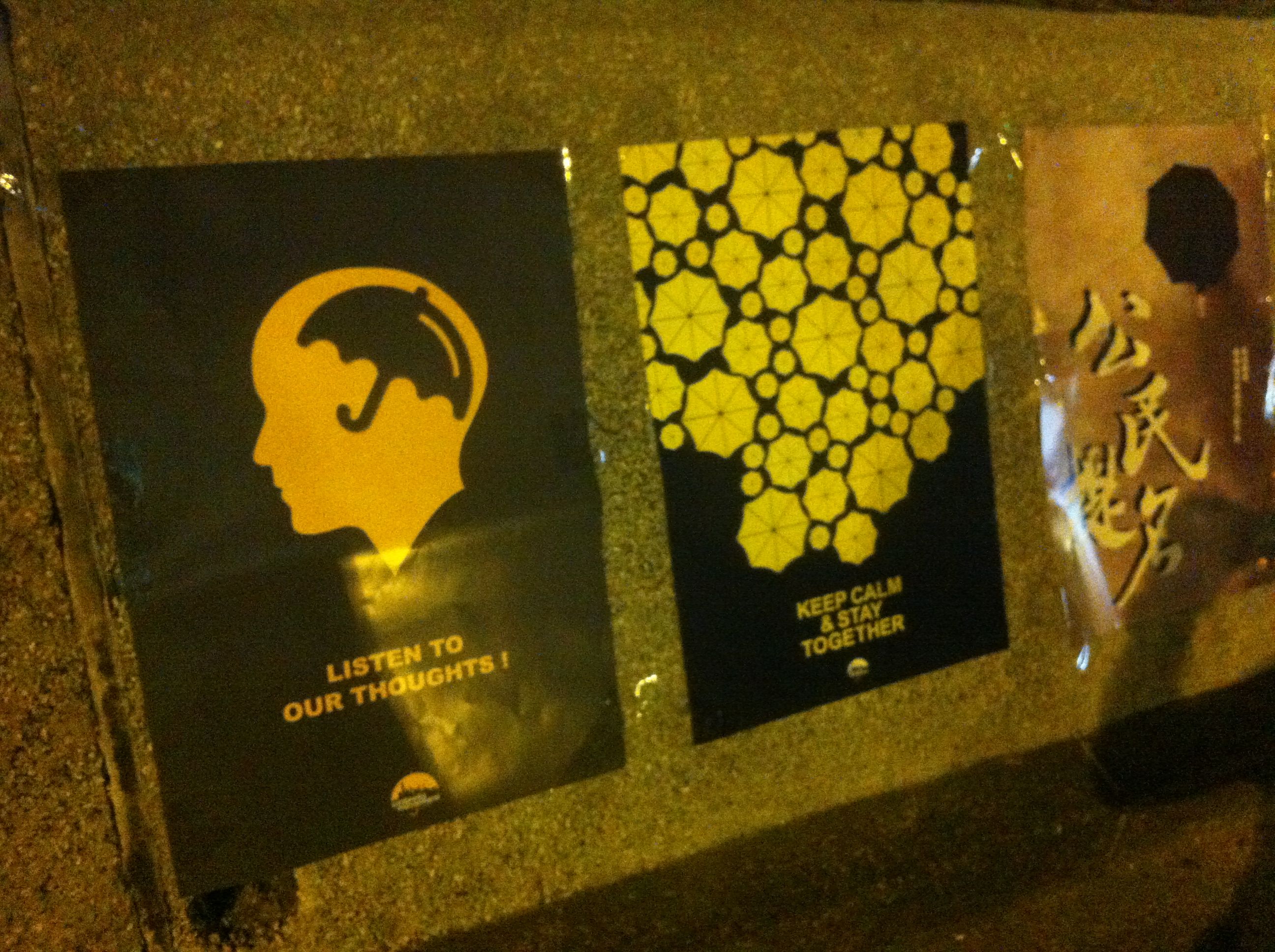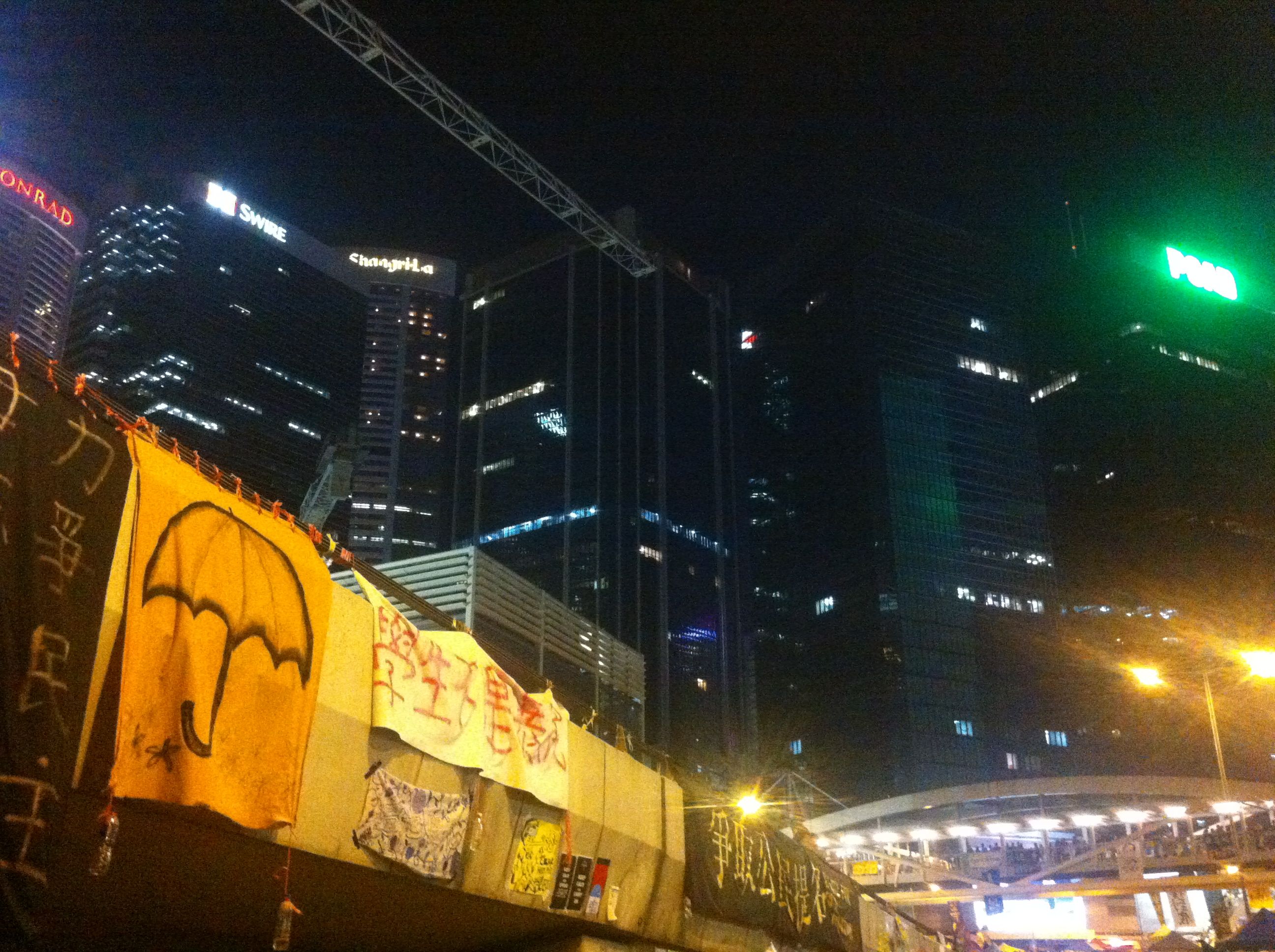 Caminar entre la gente es emocionante. Uno tiene la sensación de estar viviendo una especie de Mayo parisino del 68. Lo llaman la Revolución de los Paraguas. En Hong Kong todo el mundo lleva un paraguas en la bolsa. En cualquier momento puede caerte una tromba de agua o lucir el sol, y para ambos casos es necesario, así que el paraguas se ha convertido en el símbolo del movimiento. Ni un coche o contenedor quemado, todo limpio, todo ordenado, todo cívico. La gente agradece de corazón tu interés por la situación y se les ve intercambiar ideas con calma y respeto. El ambiente sólo se enrarece cuando interviene la policía para mediar en los enfrentamientos entre partidarios del gobierno chino y el de Hong Kong. Rara vez se llega a las manos pero el tono de las discusiones puede llegar a ser muy elevado. Os dejo este vídeo que, aunque no es de la mejor calidad, servirá para que os hagáis una idea…